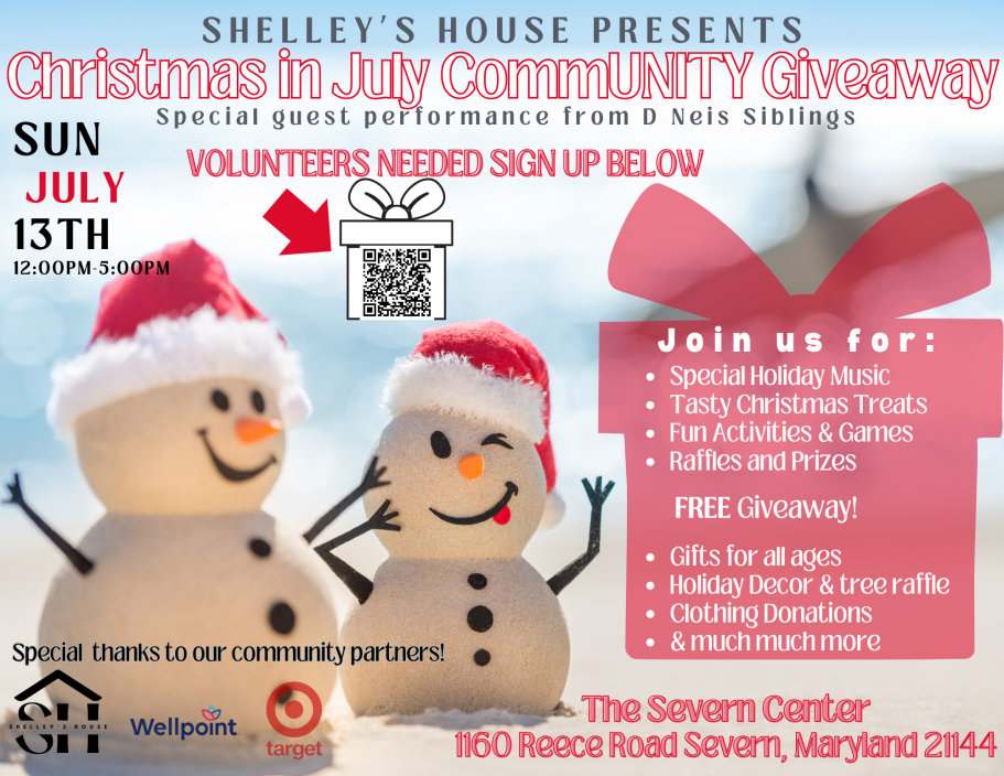 Every summer, Shelley’s House brings the spirit of giving to life with our Christmas in July CommUNITY Giveaway—a heartwarming event designed to uplift and support families across Severn, Fort Meade, Brooklyn Park, and surrounding Anne Arundel County communities.